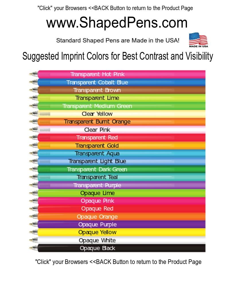 Candy Pen. Our "Standard Size" fun shaped novelty pen is a full sized promotional ballpoint ink pen bent into one of our hundreds of available shapes. This promotional shaped pen is available in a variety of opaque and transparent colors and includes a personalized custom barrel imprint. Includes a matching cap. Candy Pens Promotional products are intended for use by adults and are not suitable for children under the age of 12. Products are not intended for use by children or pets. Small parts, they may present a choking hazard to children under 3 years of age.