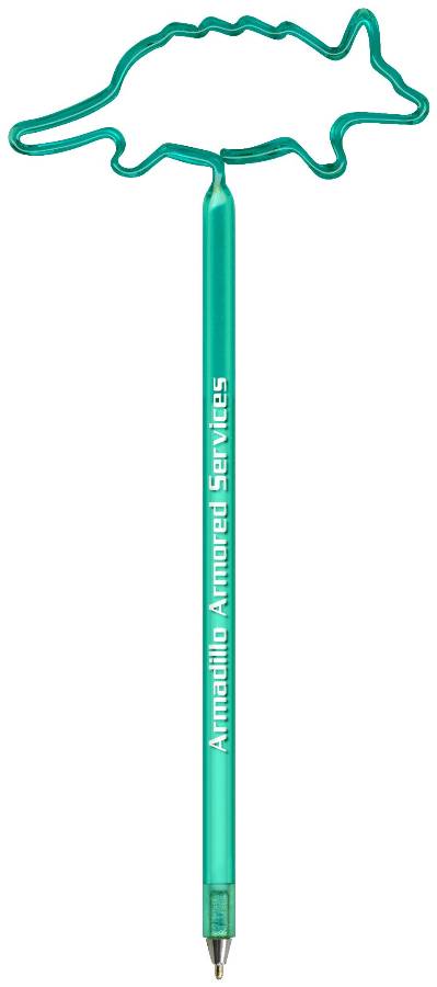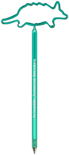 Armadillo Pen. Our "Standard Size" Animal fun shaped novelty pen is a full sized promotional ballpoint ink pen bent into one of our hundreds of available shapes. This promotional shaped pen is available in a variety of opaque and transparent colors and includes a personalized custom barrel imprint. Includes a matching cap. Animal Armadillo Pens Promotional products are intended for use by adults and are not suitable for children under the age of 12. Products are not intended for use by children or pets. Small parts, they may present a choking hazard to children under 3 years of age.