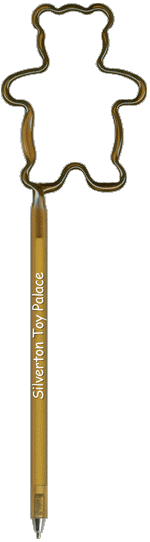 Teddy Bear Pen. Our "Standard Size" Animal fun shaped novelty pen is a full sized promotional ballpoint ink pen bent into one of our hundreds of available shapes. This promotional shaped pen is available in a variety of opaque and transparent colors and includes a personalized custom barrel imprint. Includes a matching cap. Teddy Bear Pens Promotional products are intended for use by adults and are not suitable for children under the age of 12. Products are not intended for use by children or pets. Small parts, they may present a choking hazard to children under 3 years of age.